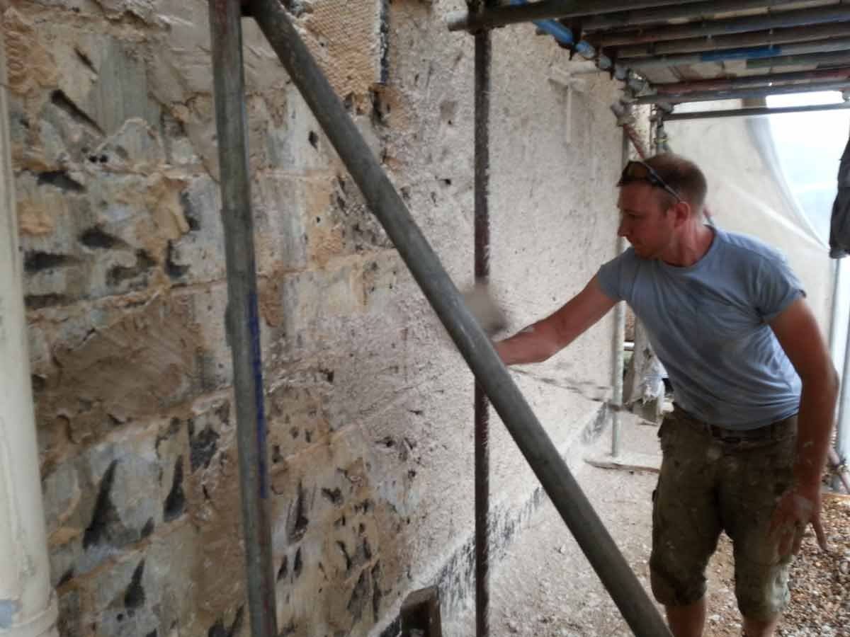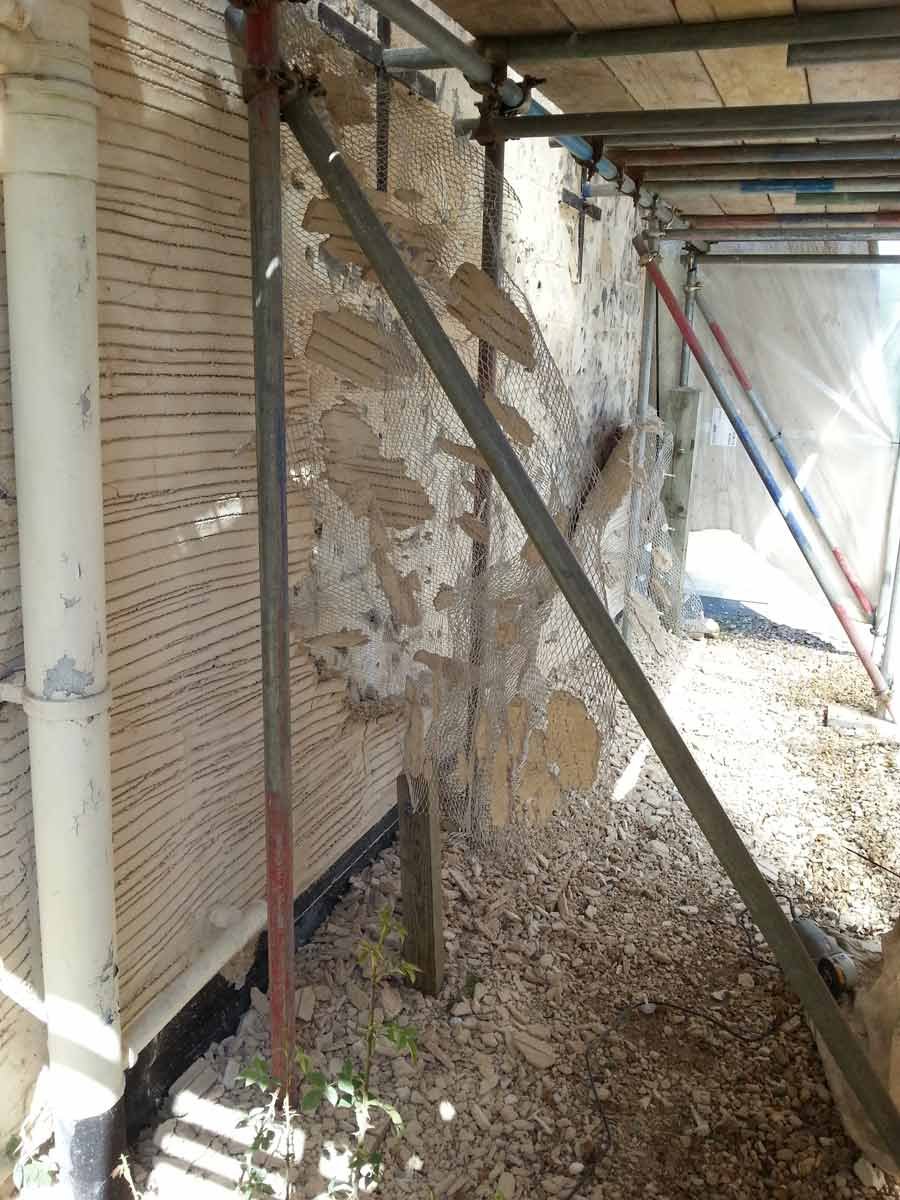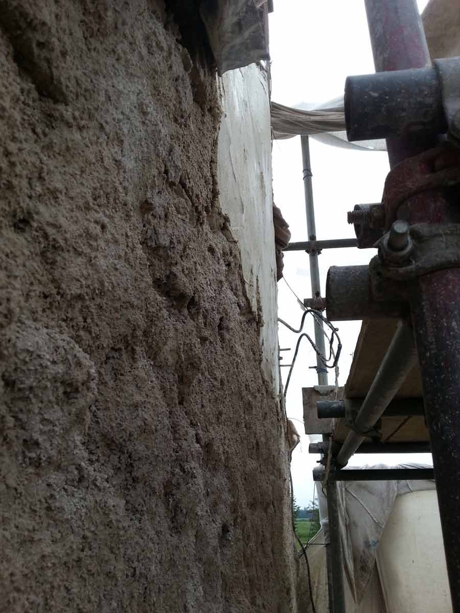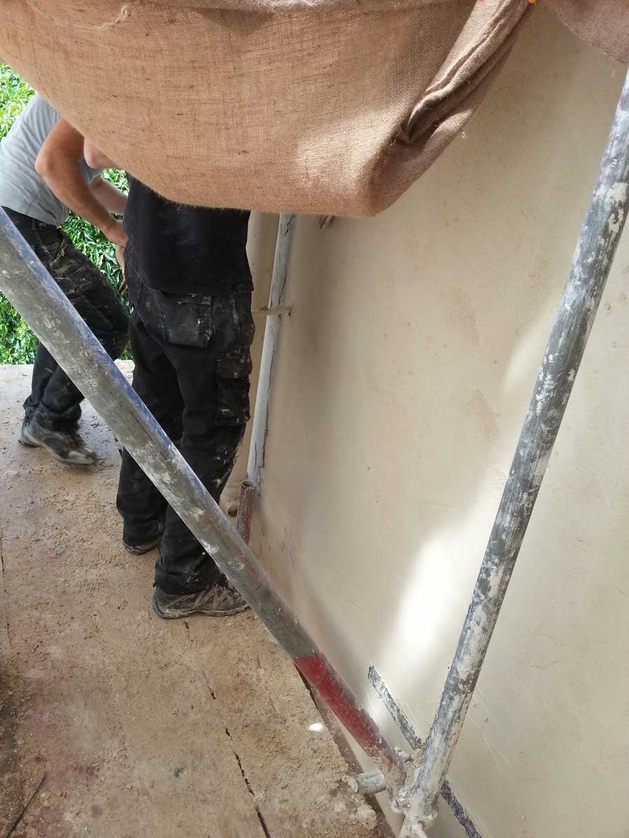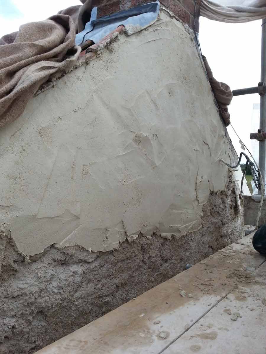 A coarse mix of haired (horse and goat) Lime Putty Render was then applied in two coats followed by an un-haired, floated, Top Coat, carefully hydrated and protected until the Putty had completed its shrinkage.