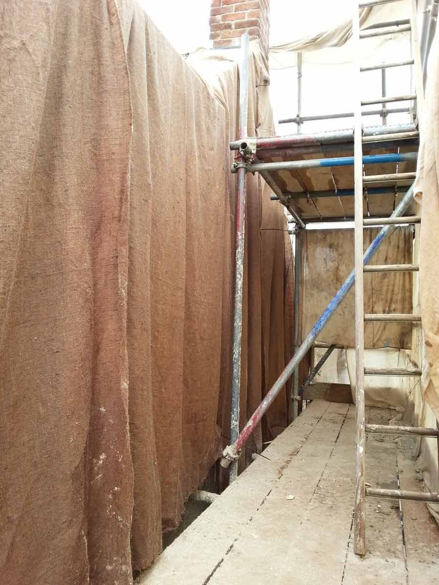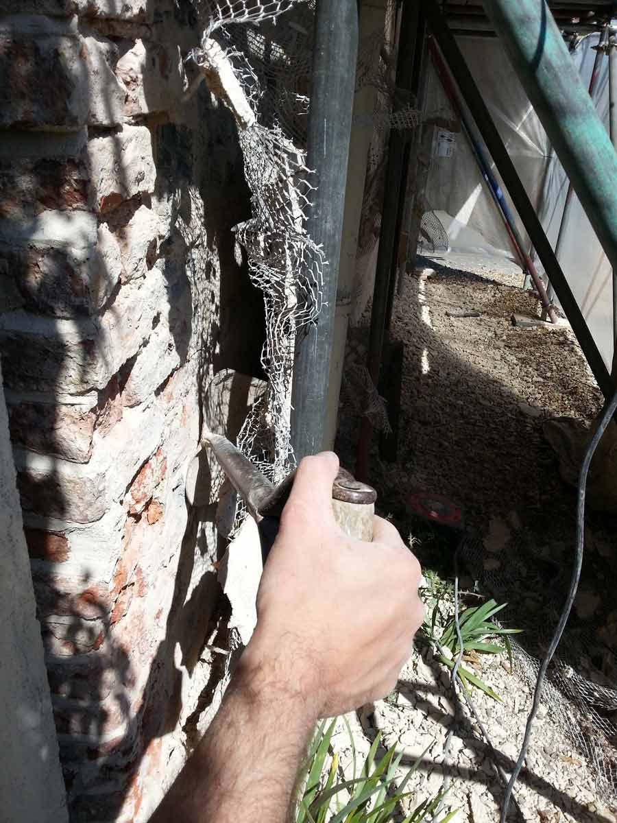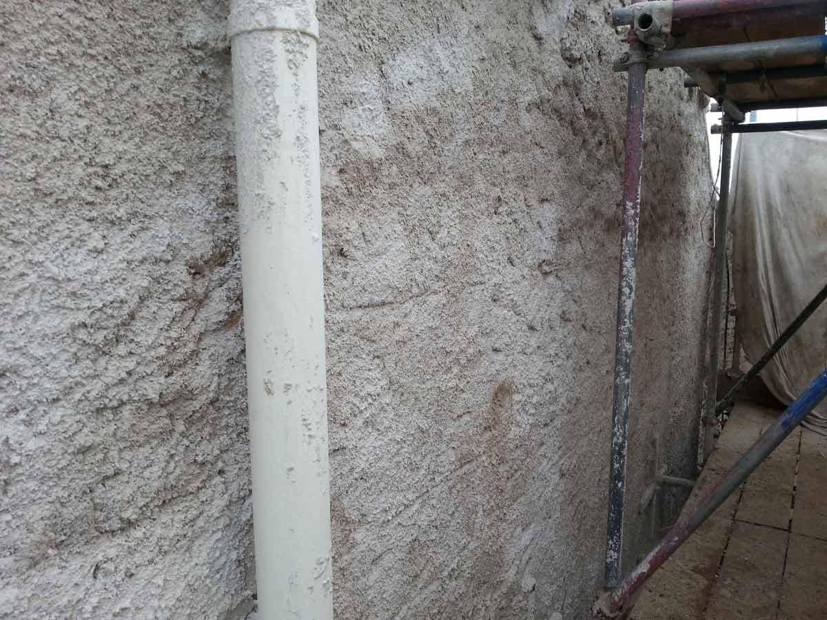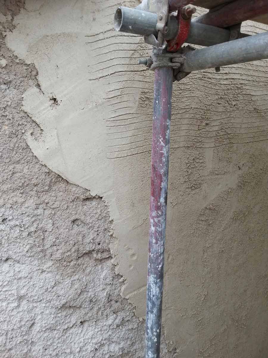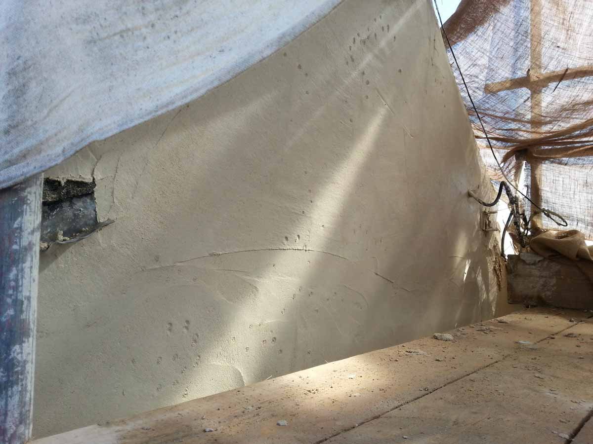 A coarse mix of haired (horse and goat) Lime Putty Render was then applied in two coats followed by an un-haired, floated, Top Coat, carefully hydrated and protected until the Putty had completed its shrinkage.