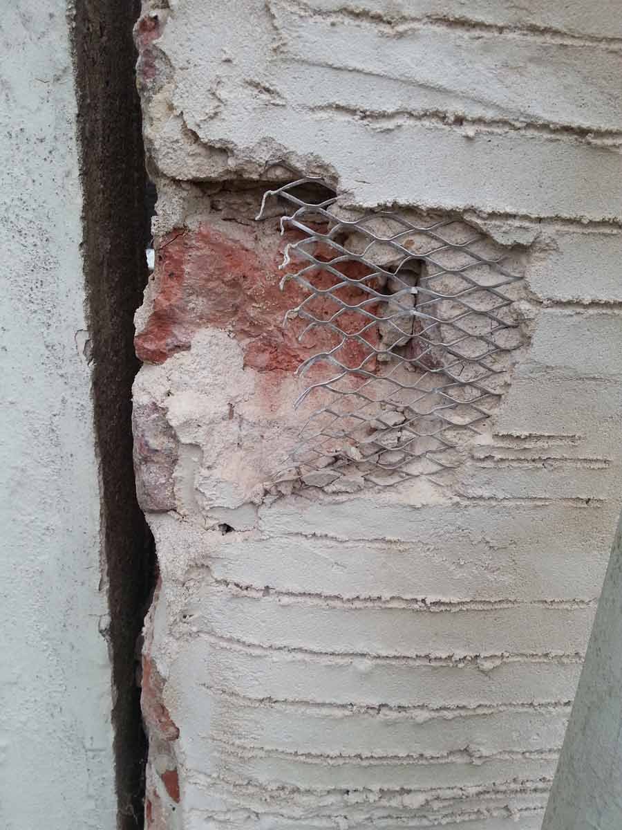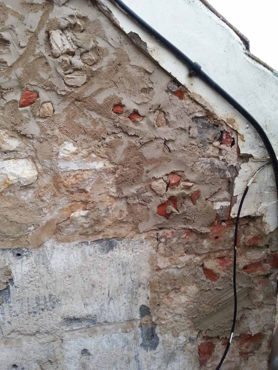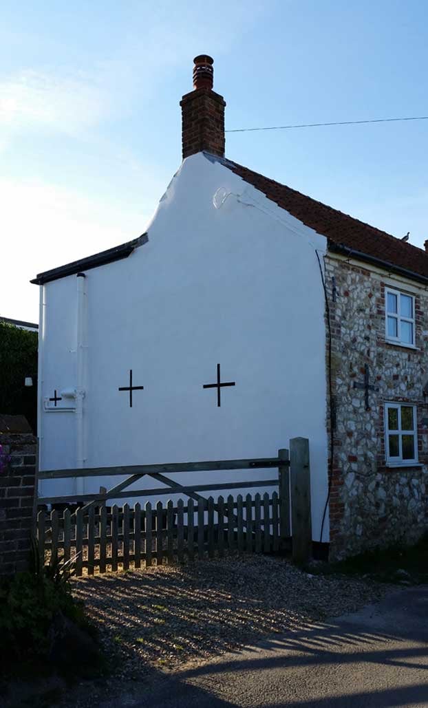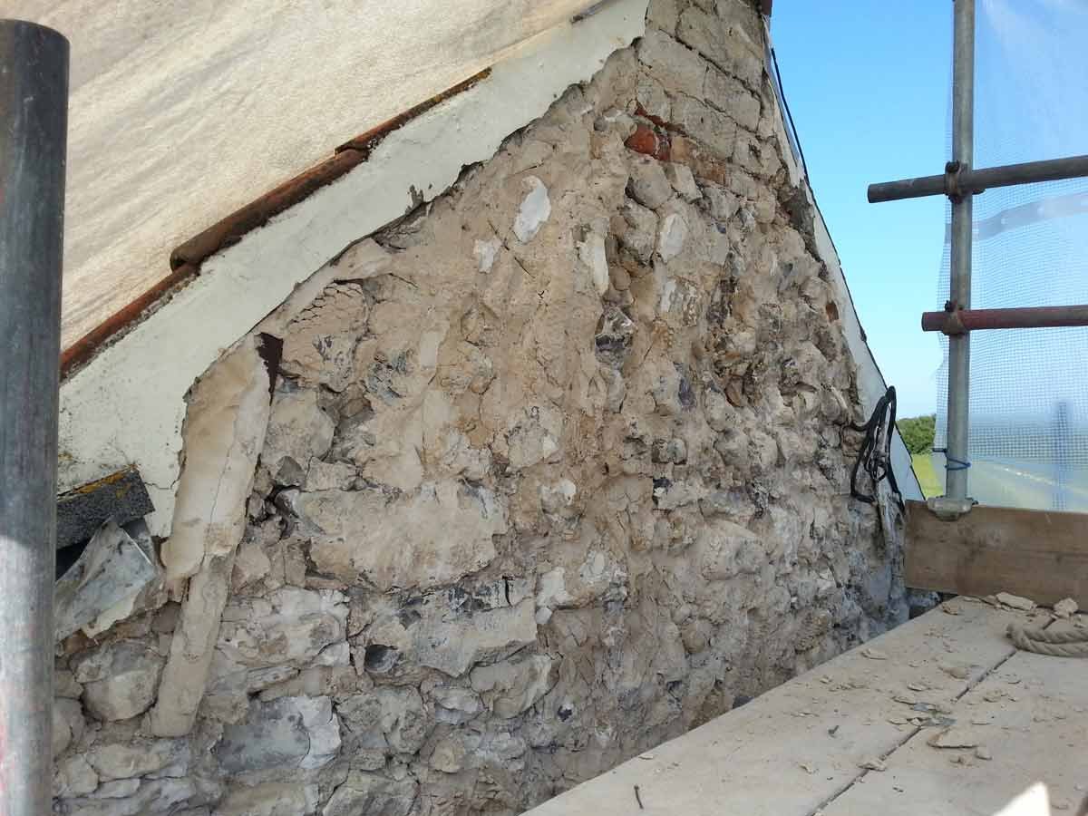 A Hydraulic Lime Rendering had been applied to the gable end of a cottage on the North Norfolk coast. The work had been left without a top coat or Lime Wash for two years, it had also been applied to EML (expanded metal lath) and had begun to fail. The only option was to remove the Render / EML, replacing it with Lime Putty render applied directly to the building substrate after rebuilding the damage to the Gable by dubbing out, adding pinnings and Lime pointing, followed by a Harling Coat.