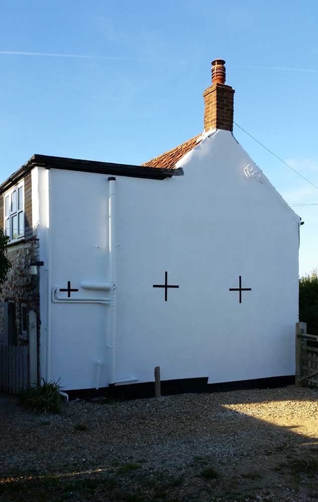 The Lime rendering was then treated to five coats of white Lime washing, applied using traditional techniques.